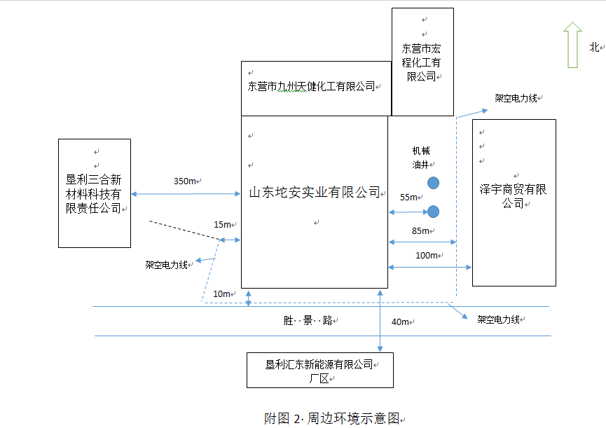 山東坨安實業有限公司非危化品油品存儲項目位於東營市墾利區勝坨鎮,本項目總占地麵積33944.1m2(約50.91畝)。廠區東側為澤宇商貿有限公司(石油化工企業),南側為勝景路,路對麵為墾利彙東新能源有限公司(石油化工企業),西側為墾利三合新材料科技有限責任公司(石油化工企業),北側為東營市九州天健化工有限公司(精細化工企業),東北側為東營市宏程化工有限公司(石油化工企業)。 |