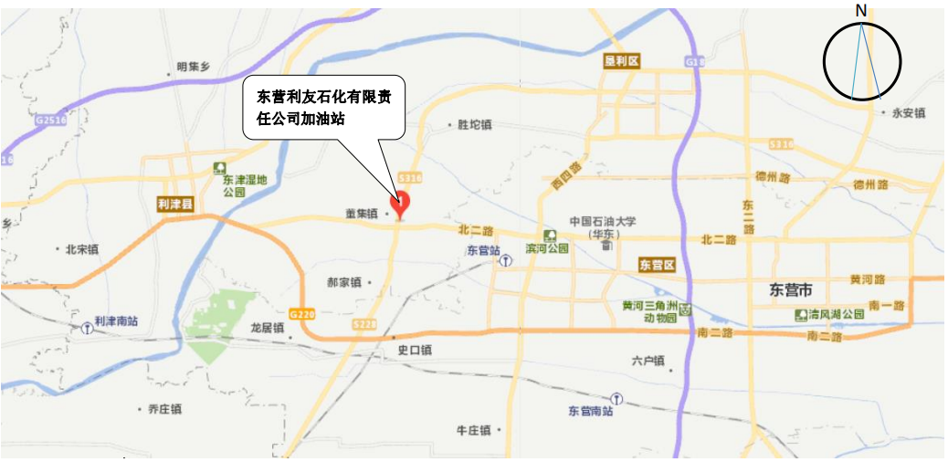 東營利友石化有限責任公司加油站位於董集鄉政府南富園路(東利路)與董勝路(S316)交彙處。該加油站東側為民用建築;西側為廢棄儲物間與瀝青罐(罐已停用);該加油站距離南側富園路(東利路)約15m,路對麵為空地,站區與富園路之間設有一根架空通信線;站區西北側設有6個地上儲罐,現今已廢棄。站區北為一條鄉村道路,路北側為民房建築。 |