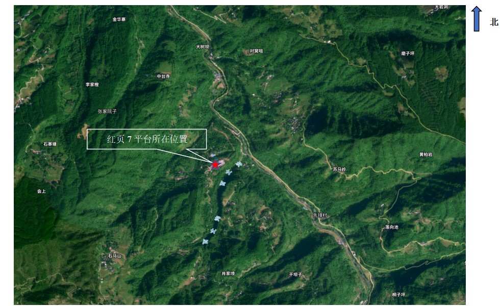 紅頁7平台處於山地中,周圍主要為山地林區,周邊分布有散居民房,新建井口距離西南側散居民房約117m,距離北側民房約140m,與西側架空電力線路約77.5m,與南側架空電力線路約67m。 |
