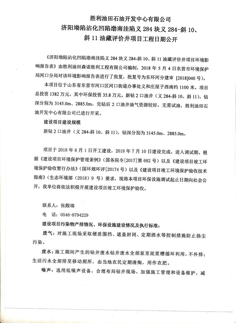 勝利油田石油開發中心有限公司濟陽坳陷沾化凹陷渤南窪陷義284塊義284-斜10、斜11油藏評價井項目工程日期公開