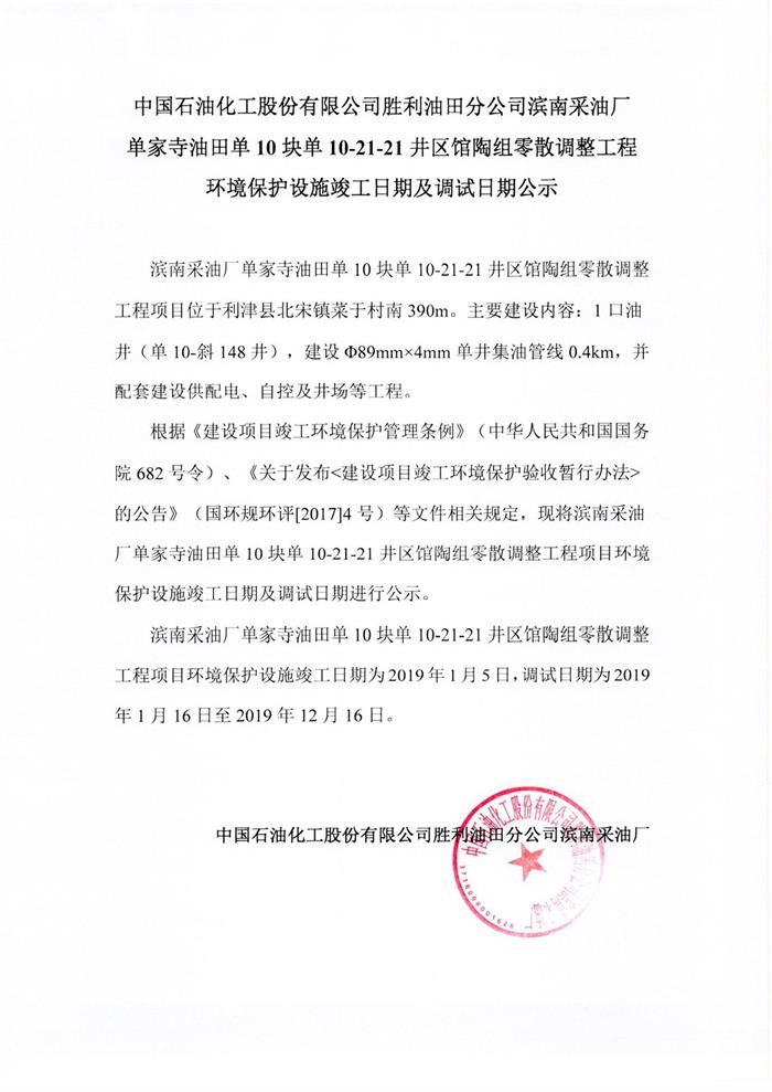 中國石油化工股份有限公司勝利油田分公司濱南采油廠單家寺油田單10塊單10-21-21井區館陶組零散調整工程環境保護設施竣工日期及調試日期公示