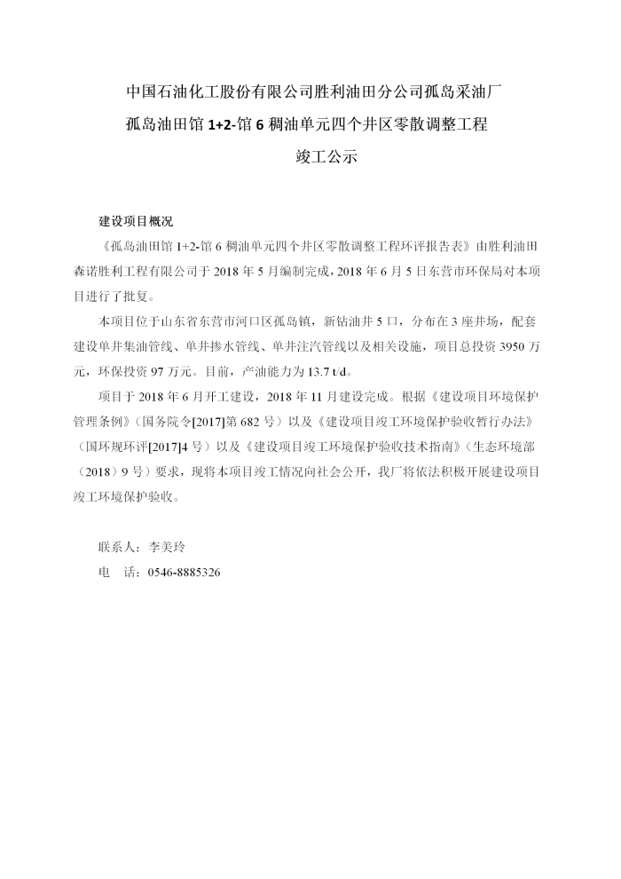 中國石油化工股份有限公司勝利油田分公司孤島采油廠孤島油田館1+2-館6稠油單元四個井區零散調整工程竣工公示