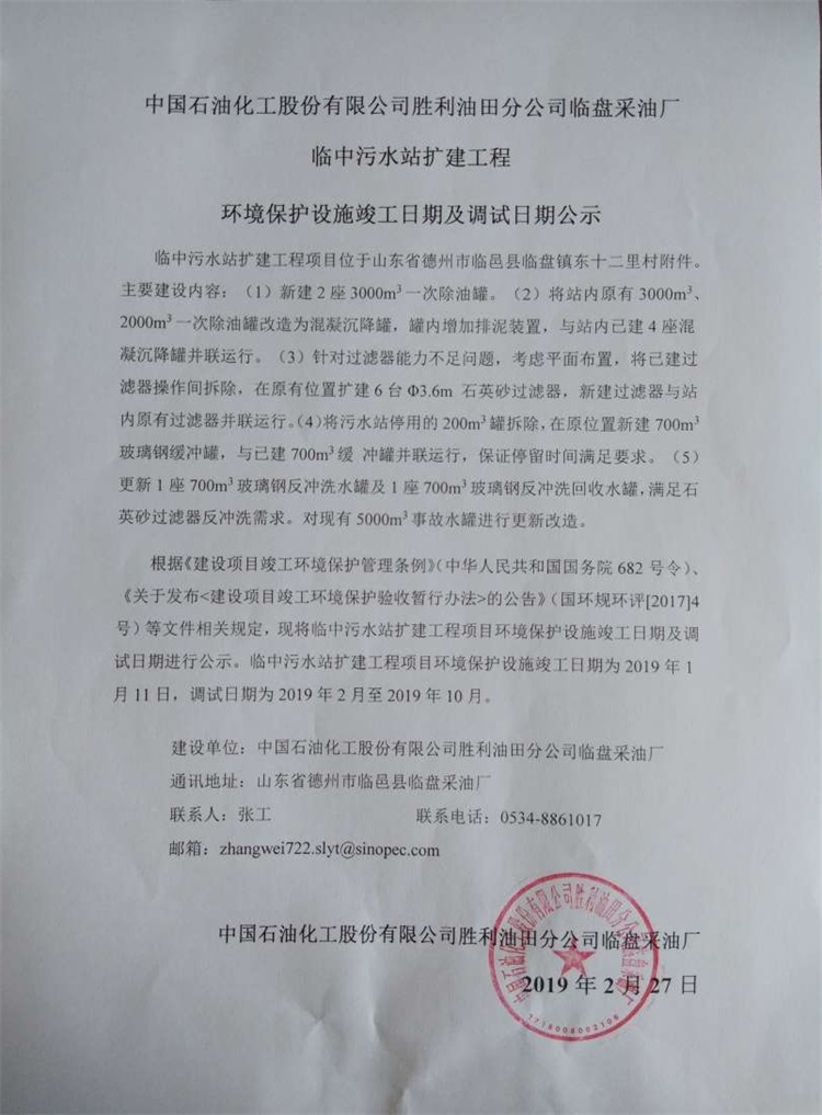 中國石油化工股份有限公司勝利油田分公司臨盤采油廠臨中汙水站擴建工程環境保護設施竣工日期及調試日期公示