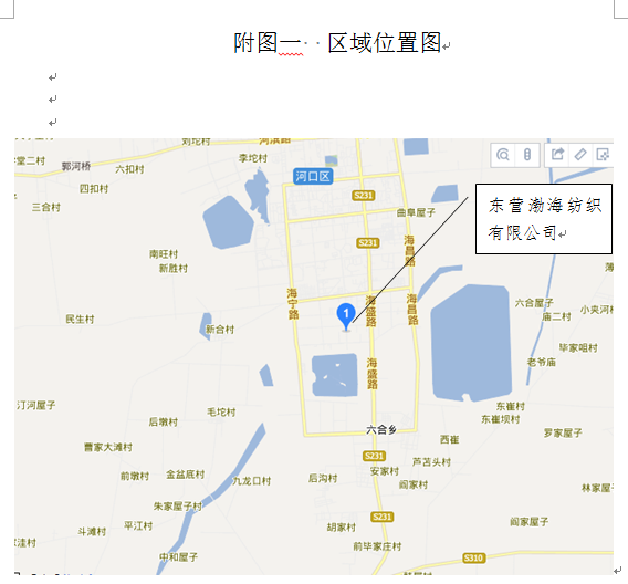 東營渤海紡織有限公司位於東營市河口區海河路以西、陽河路以北,占地麵積100畝。廠區所在地南麵為陽河路,距離為20m,廠區西麵為東營市布萊特石油裝備有限公司、東營市三鎮服飾有限公司,距離大約15m;東麵為海河路,距離大約為20m,海河路以東為金色河口(集團)新型材料有限責任公司、預製砂漿廠、東營建友新型材料有限公司、彙昶飼料廠和東營市廣和化工有限公司),距離為80m;北麵為金河路,距離大約為20m,金河路以北為東營市大中南實業有限公司,距離大約為120m。 |
