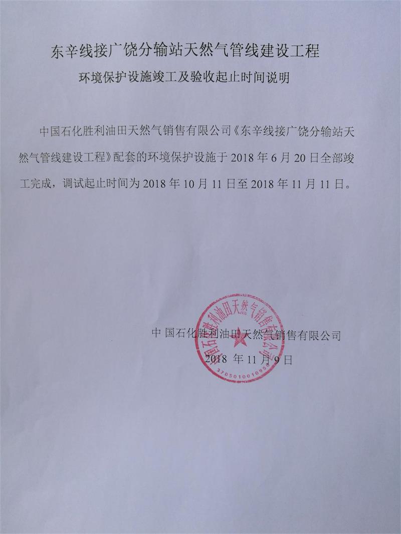 東辛線接廣饒分輸站天然氣管線建設工程環境保護設施竣工及驗收起止時間說明