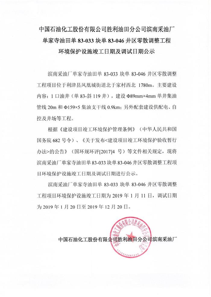 中國石油化工股份有限公司勝利油田分公司濱南采油廠單家寺油田單83-033塊83-046井區零散調整工程環境保護設施竣工日期及調試日期公示