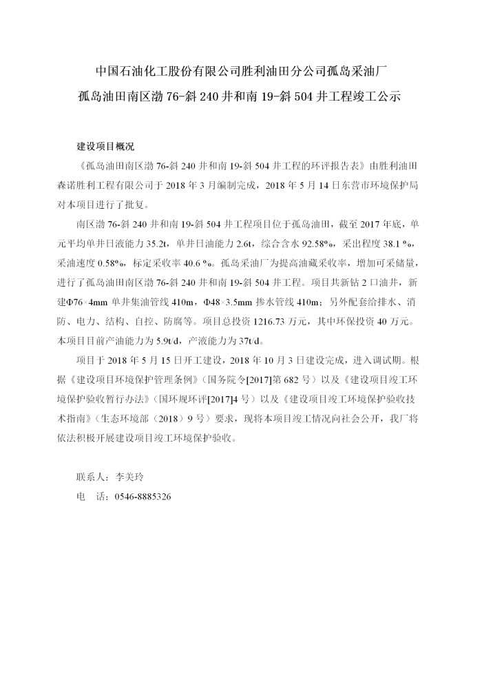 中國石油化工股份有限公司勝利油田分公司孤島采油廠孤島油田南區渤76-斜240井和南19-斜504井工程竣工公示