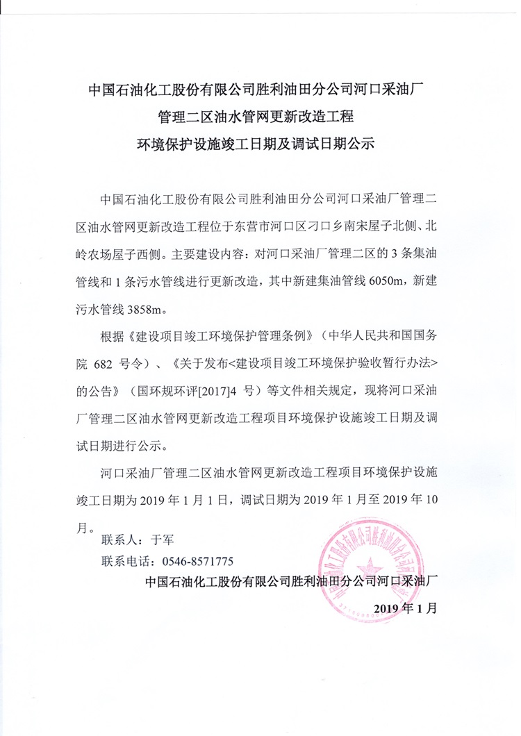 中國石油化工股份有限公司勝利油田分公司河口采油廠管理二區油水管網更新改造工程環境保護設施竣工日期及調試日期公示