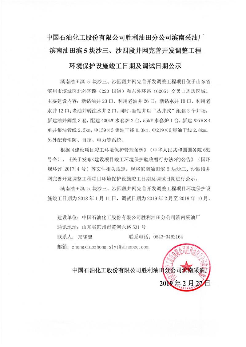 中國石油化工股份有限公司勝利油田分公司濱南采油廠濱5塊沙三、四段井網完善開發調整工程環境保護設施竣工日期及調試日期公示