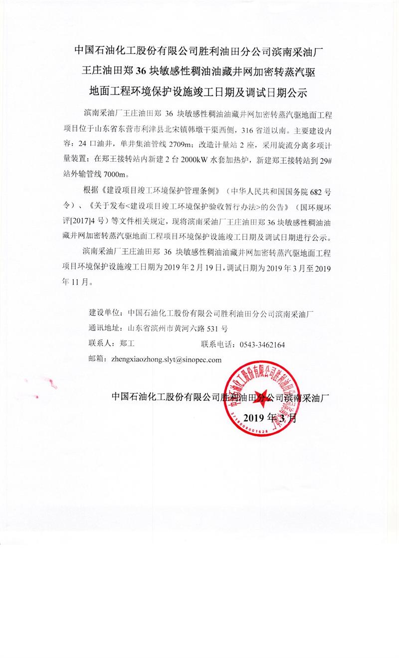 中國石油化工股份有限公司勝利油田分公司濱南采油廠王莊油田鄭36塊敏感性稠油油藏井網加密轉蒸汽驅地麵工程環境保護設施竣工日期及調試日期公示